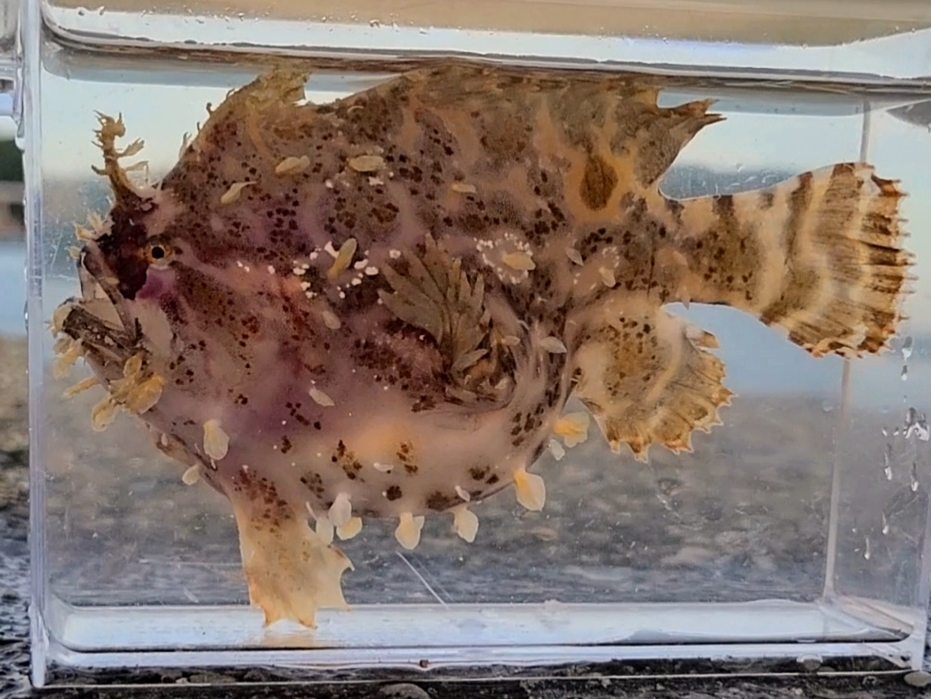 たまに流れ藻が漁港や砂浜へと流れ着き、それに乗ったハナオコゼが私たちの前に姿を見せることがあります。