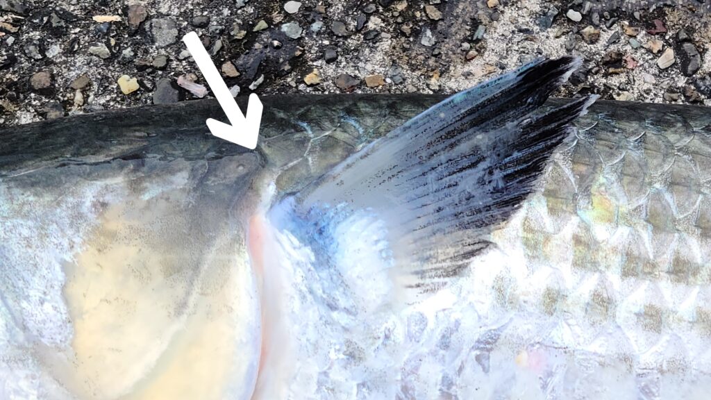ボラの胸びれの根元には青色の斑があり、この点で他のボラ科魚類と見分けることができます。