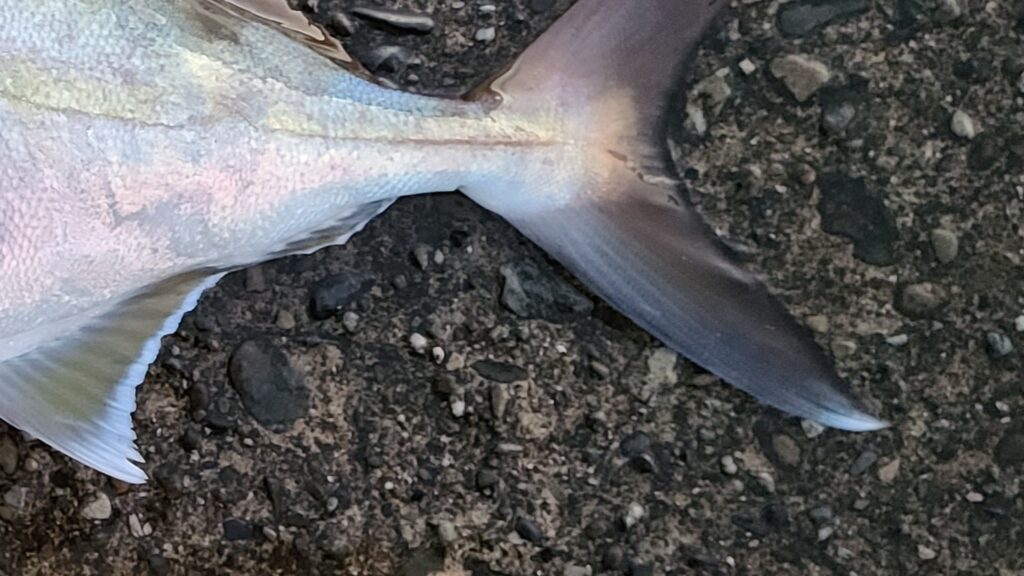 また尾びれの下端が白く色付いているのも特徴で、ここが近縁種の「ヒレナガカンパチ」との見分けのポイントです。