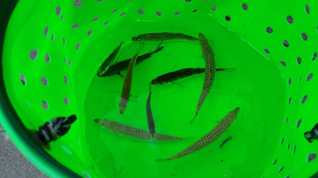 釣れた小魚たちはとりあえずスカリに入れて、海中で活かしておきます。
