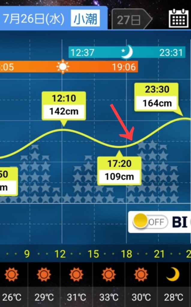 ちなみにタイドグラフを確認すると、アコウが食い付いた時間帯は「潮の動きはじめ」と「夕マズメ」が重なる好タイミングでした。