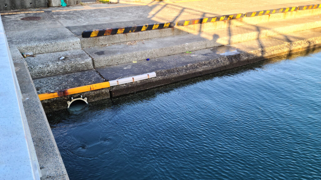 排水溝があって水流のよじれができているので、魚が集まっているかも。