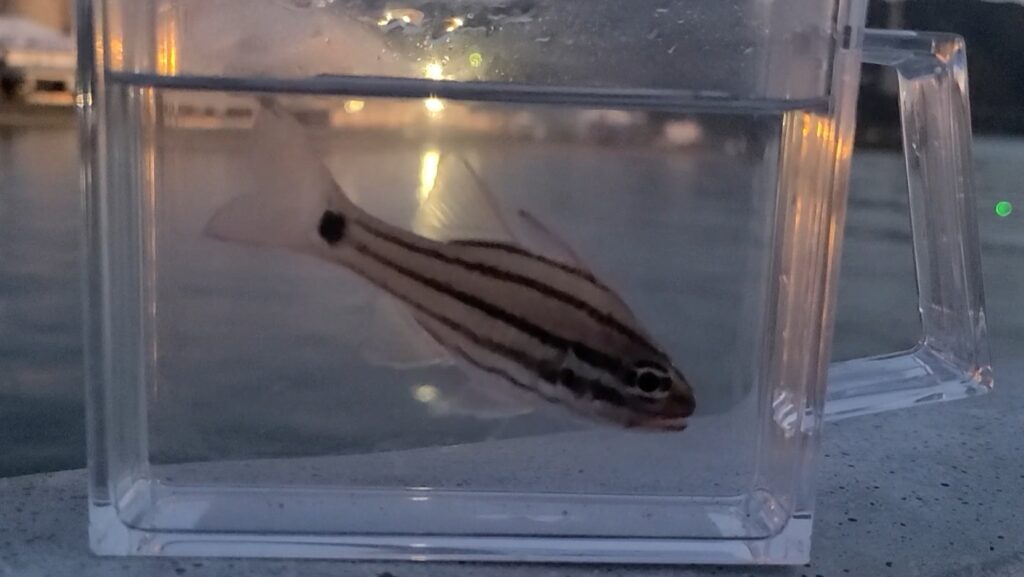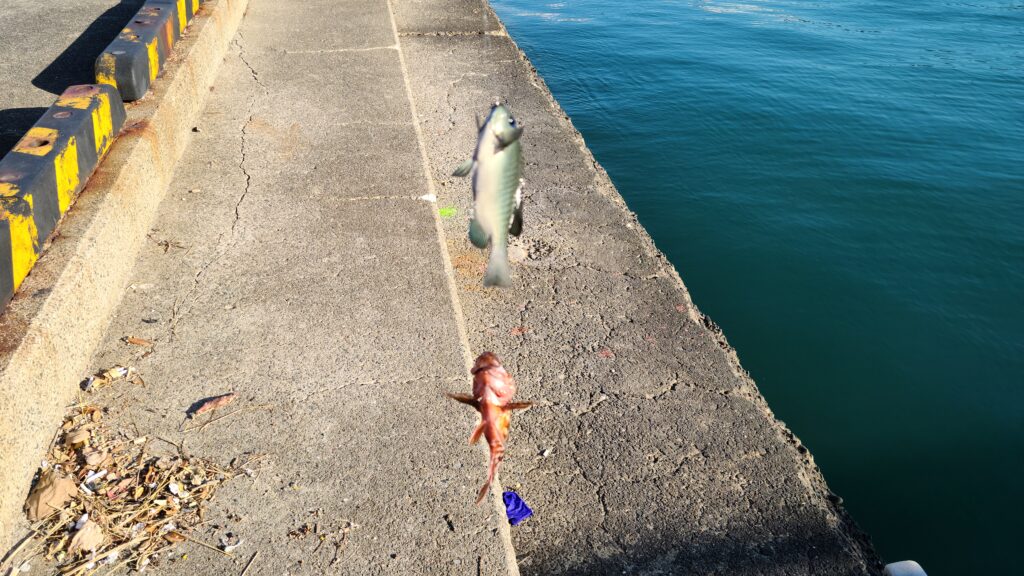 ちなみに小物釣りの傍ら、釣れたウリボウを餌にして泳がせ釣りに挑戦していたのですが、置き竿にヒットはありませんでした。残念。