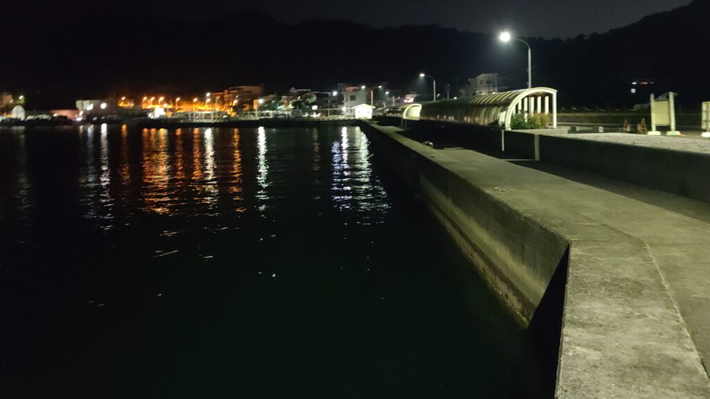 暗い堤防でこの強風は危険だと判断し、常夜灯の点いた港内へと戻ることにしました。