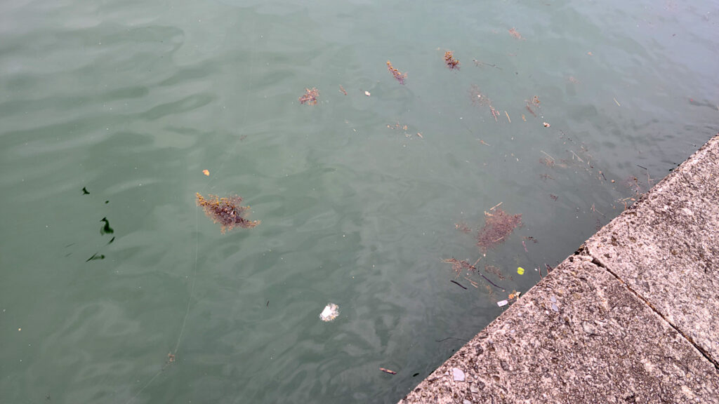 ふと気付くと、岸壁際を小魚の群れが回遊しているのが見えました。