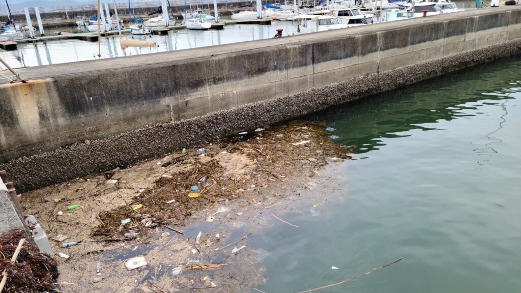 期待通り、漁港の片隅には海藻やゴミがたくさん流れ着いています。