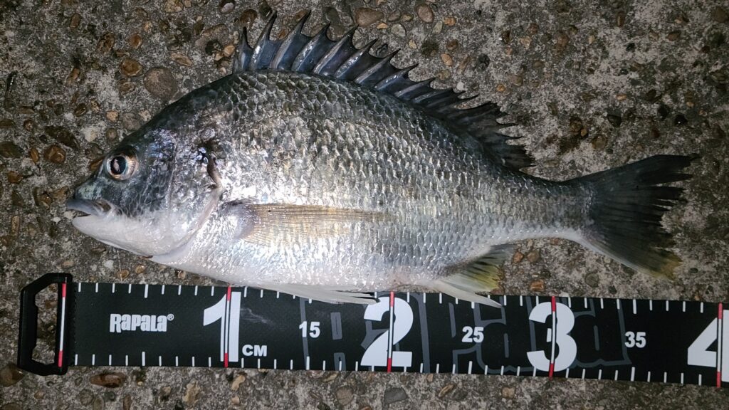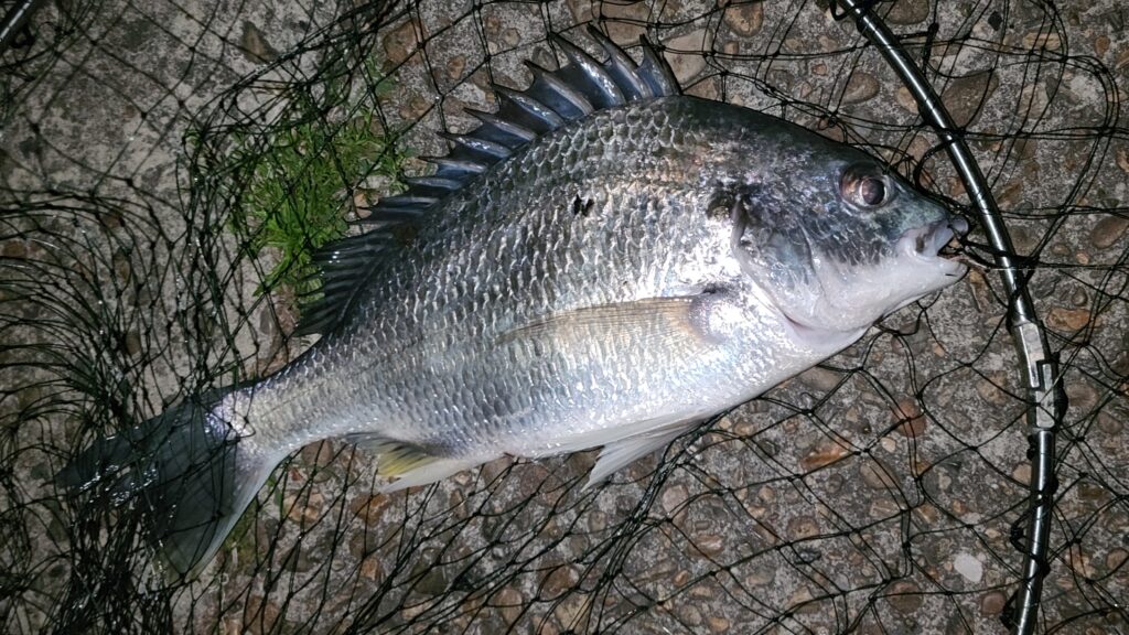 夜中に釣れたキビレは38cm。
