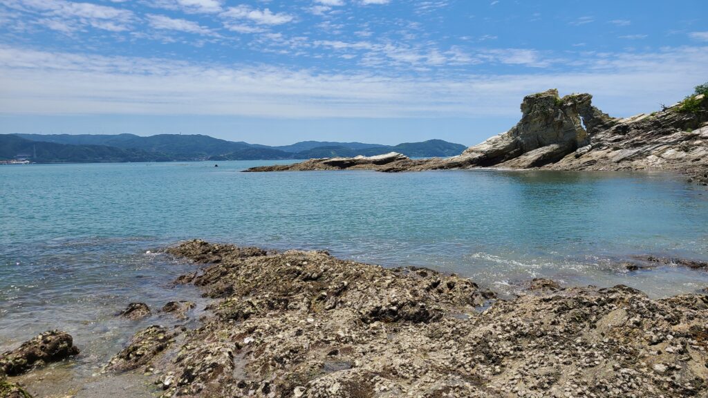 漁港の西側には小さな砂浜があり、さらにその奥には浅い磯場が広がっています。